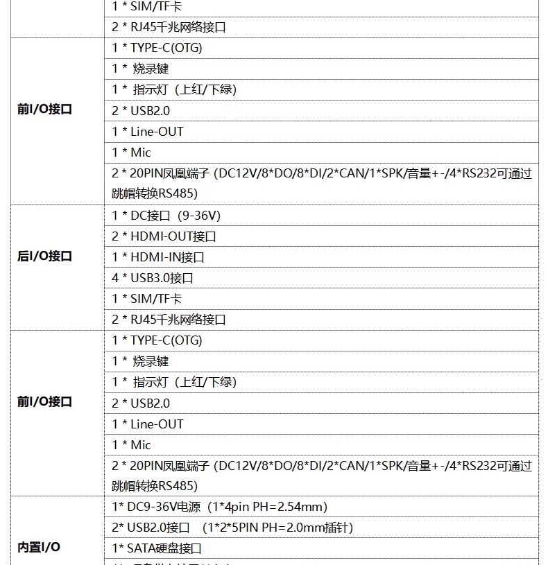 ◆2 * 20PIN凤凰端子(DC12V/8*DO/8*DI/CAN1/CAN2/1*SPK/音量+-/4*RS232/4*RS485,4个RS232和RS485通过跳帽转换)