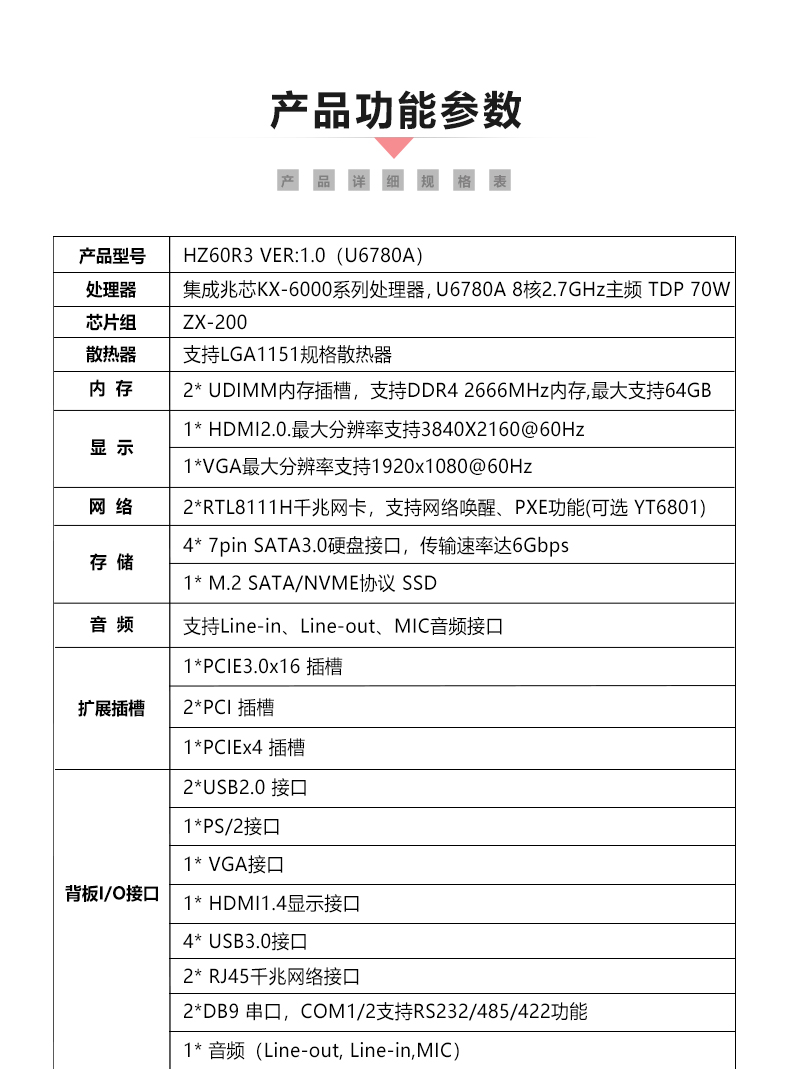 ◆集成兆芯KX-6000系列处理器, U6780A 8核2.7GHz主频 TDP 70W