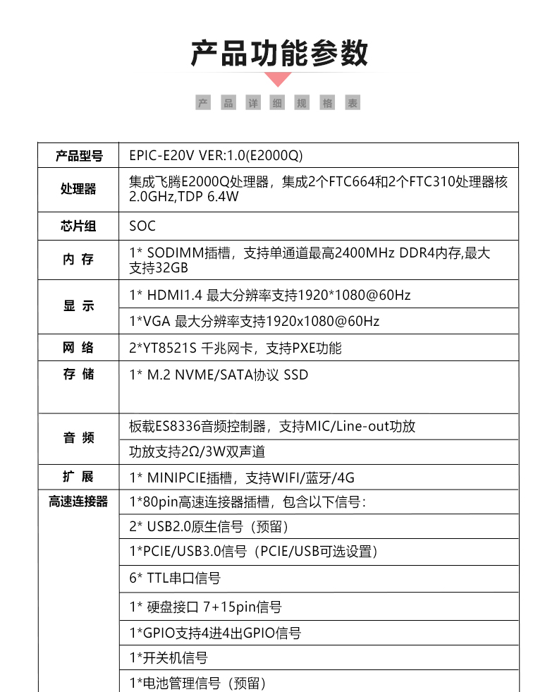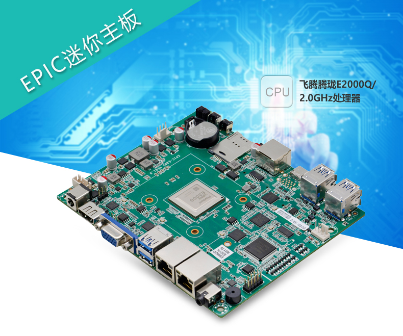 ◆集成飞腾E2000Q处理器,集成2个FTC664和2个FTC310处理器核2.0GHz,TDP 6.4W